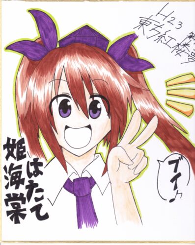 で、友人がサークルに置いてくれる色紙。 計四枚、そのうちの二枚、はたてとアリスです。勿論残りの二枚は文ちゃんと椛です。 スペース【ヒ-31a】 サークル『ウール100%』 です。また、友人:のんびり羊さんが今回出すコピ本に、恐れ多くもゲスト原稿を掲載…